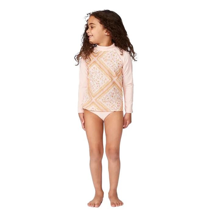 Rip Curl Moonflower 2 Piece Set Girls The Moonflower Two Piece Swim Set is a fashionable and protective choice for younger girls. With its SPF 50+ very high protection, it ensures optimal sun protection for their delicate skin. The placement print and yardage print panels add a trendy and playful touch to the swim set. Crafted with quality materials, it offers both comfort and durability. Whether theyre swimming, playing in the pool, or enjoying a day at the beach, the Moonflower Two Piece Swim Set is a reliable choice that keeps them looking stylish while providing sun protection.