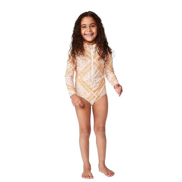 Rip Curl Moonflower Tides Surfsuit Girls The Moonflower Tides Surfsuit is a stylish and protective choice for younger girls. With its branded clamp label, it adds a stylish detail to the surfsuit. Featuring an all-over yardage print, it adds a vibrant touch to their beach look. The SPF 50+ very high protection ensures optimal sun protection for their sensitive skin. The 5-gauge zip at the front allows for easy wear and removal. Crafted with care, this surfsuit offers both comfort and durability, making it perfect for their water adventures.