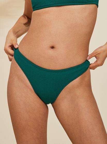 Made of textured, eco-conscious swim fabric, these cheeky solid bikini bottoms have a low-rise waist and a high leg cut to flatter your curves.