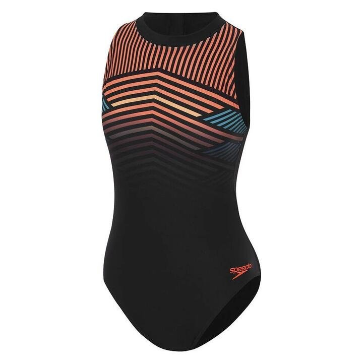 Speedo Digital Placement Hydrasuit Womens Make waves during your fitness training wearing our super-flattering Hydrasuit, which features a high neckline and full back coverage for a sleek, streamlined silhouette. The bold, geometric print draws on our Australian heritage with a graphic chevron design inspired by the swim lanes of Sydney’s iconic Bondi Icebergs pool. A comfy bust underband helps provide a supportive fit allowing you to focus on your performance, while the zip-up back includes an extended puller for easy changing. Designed to be durable and better for the environment, the suit features our new ECO Endurance+ fabric, which is 100% chlorine resistant, quick-drying and made from 100% recycled post-consumer waste.