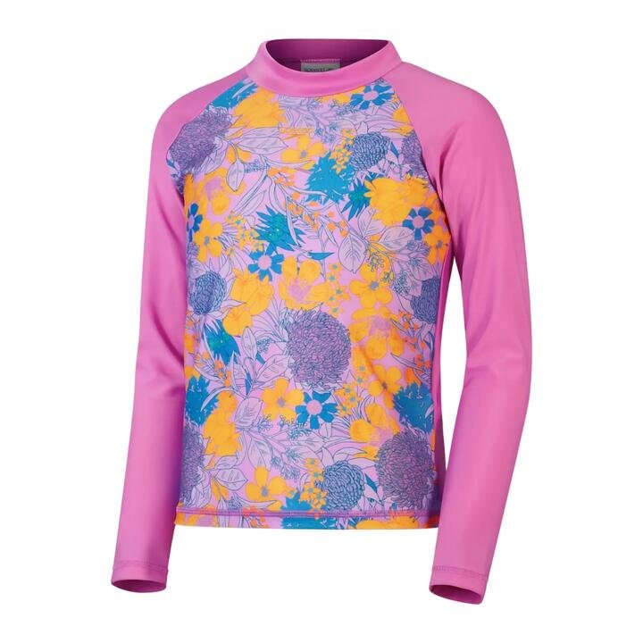 Speedo Girls Printed Longsleeve Rashi Radiate summer vibes wearing this vibrant Long Sleeve Rash Top, featuring our beautiful floral illustration print alongside violet contrasting sleeves. The comfy pull-on rash top includes UPF40 for sun protection in and out of the water. Taking young swimmers from beach to pool, our Eco EnduraBrite fabric offers higher chlorine resistance than standard swimwear fabrics, delivers superb colour performance and fits like new for longer with CREORA HighClo. Made in part from recycled plastic bottles – the polyester yarn in the Eco EnduraBrite fabric is made from 100% post-consumer waste.