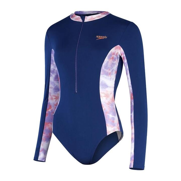 Speedo Longsleeve Panel One Piece Womens Stylish swimwear for swim, surf and SUP. Stunning in deep blue, this Long Sleeve Swimsuit includes panels of our pretty lilac tie-dye print. Ideal for ocean swimming, surfing, and days on the beach, the swimsuit offers full coverage across the chest, back and arms. A front zip opening allows you to roll down the suit for easy changing, while a comfortable bust underband provides light support. Designed to be durable and better for the environment, the suit features our new ECO Endurance+ fabric, which is 100% chlorine resistant, quick-drying and made from 50% recycled materials.