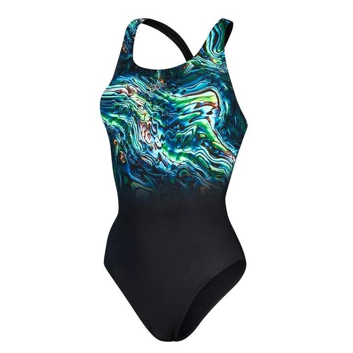 Speedo Placement Digi Powerback Womens The Speedo Powerback One Piece is a sleek black swimsuit, featuring a captivating green and blue marbled print with stunning shell-like iridescence. The suits narrow straps and open powerback style are made for training, allowing shoulder movement and flexibility, so you feel comfortable and unrestricted. Made from durable ECO Endurance+ fabric, its quick-drying and 100% chlorine resistant. Plus, one of the yarns in this fabric is made from 100% post-consumer waste, such as recycled plastic bottles.