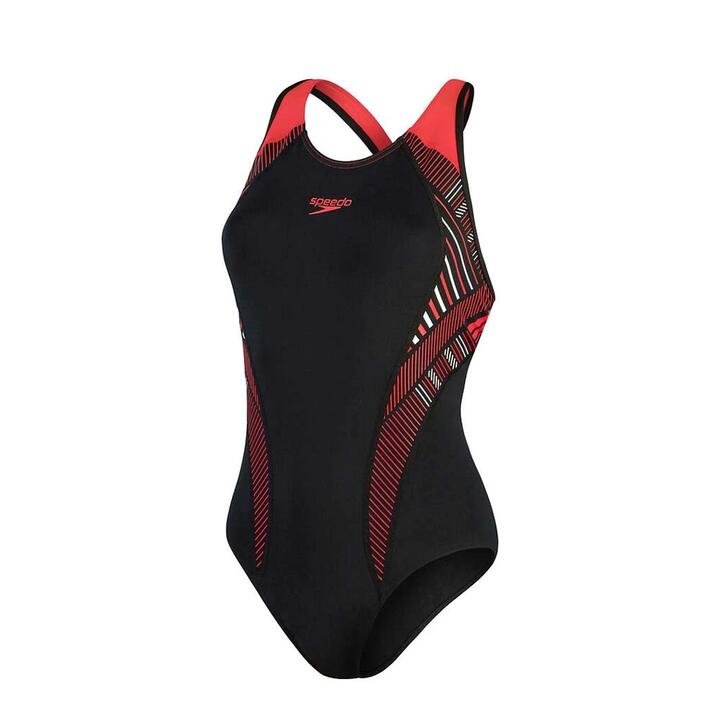 Speedo Placement Laneback Swimsuit Womens A stylish performance swimsuit that will power through your workout. The suit features our new Eco Endurance Max fabric, which is made from 100% recycled post-consumer waste and is made of durable, long-lasting material. It also features a bold side panel print inspired by the geometric lines of Sydney’s iconic Bondi Icebergs pool, as well as medium-cut leg and bust underbands that ensure your comfort and support throughout your workout.