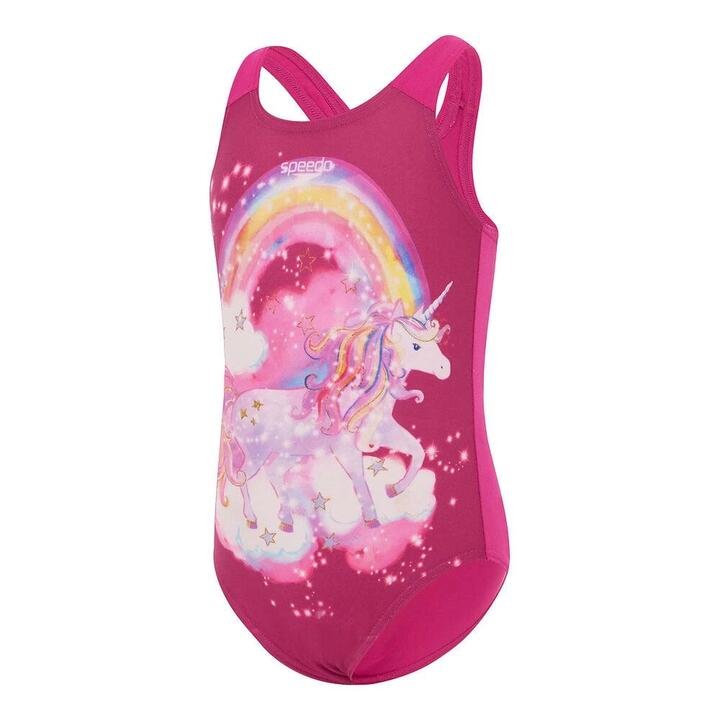 Speedo Toddler Girls Digi Printed Swimsuit Escape to a mystical land in the sky with our Learn to Swim range. Featuring a colourful unicorn and rainbow scene, this infant swimsuit is ideal for fun times in the pool and on the beach. The racerback design means your little one’s straps don’t slip around when they’re splashing about in the water. Our Endurance+ means this suit is 100% Chlorine Resistant.
